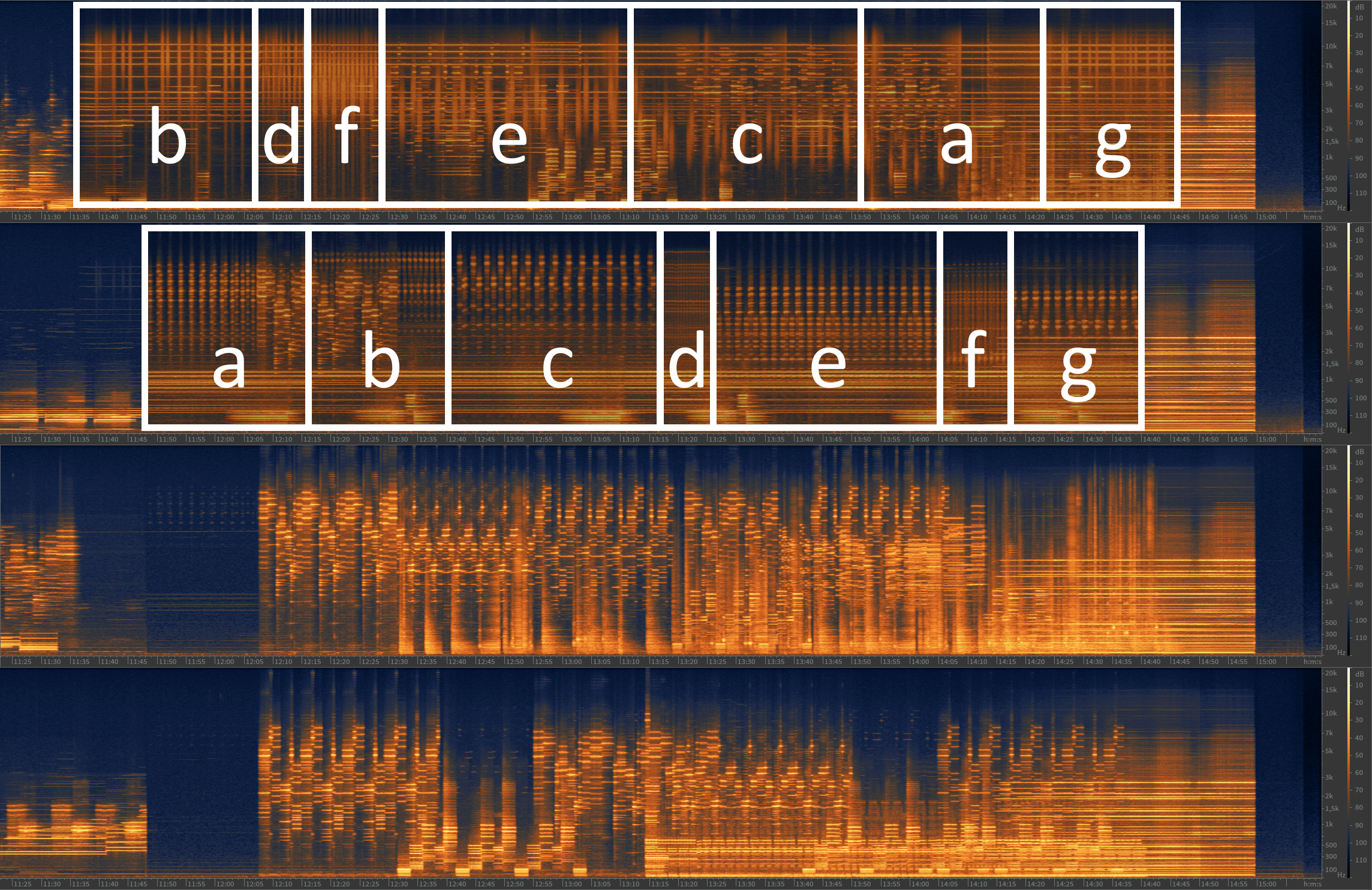 Abbildung 8: Tratto, Digitalisat des Kölner Tonbands, Spektrogramm des Schlussteils mit Visualisierung der »Ketten« aus den Impulsstrecken nach Band I und Band II