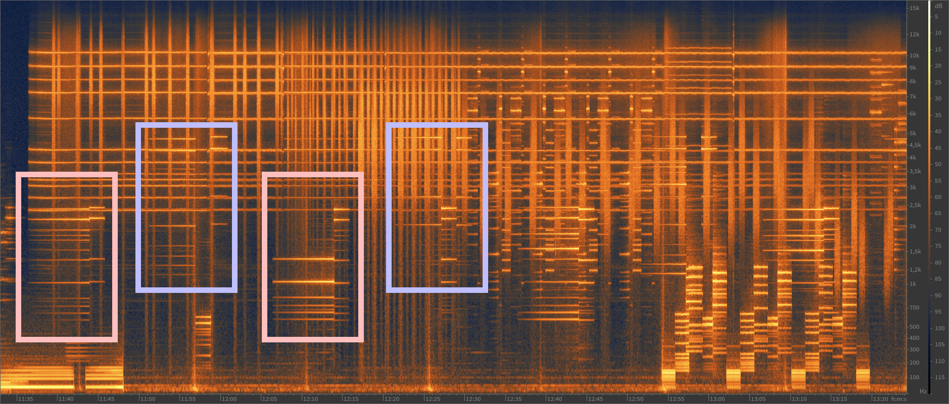 Abbildung 16: Tratto, Digitalisat des Kölner Tonbands, Spektrogramm des Schlussteils mit Visualisierung der zwei Typen von Band-I-Konstanten auf Spur 1