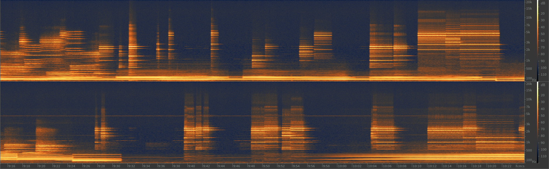 Abbildung 23: Tratto, Digitalisat des Kölner Tonbands, Spektrogramm der Band-III-Strukturen im Mittelteil auf Spur 1 und 3