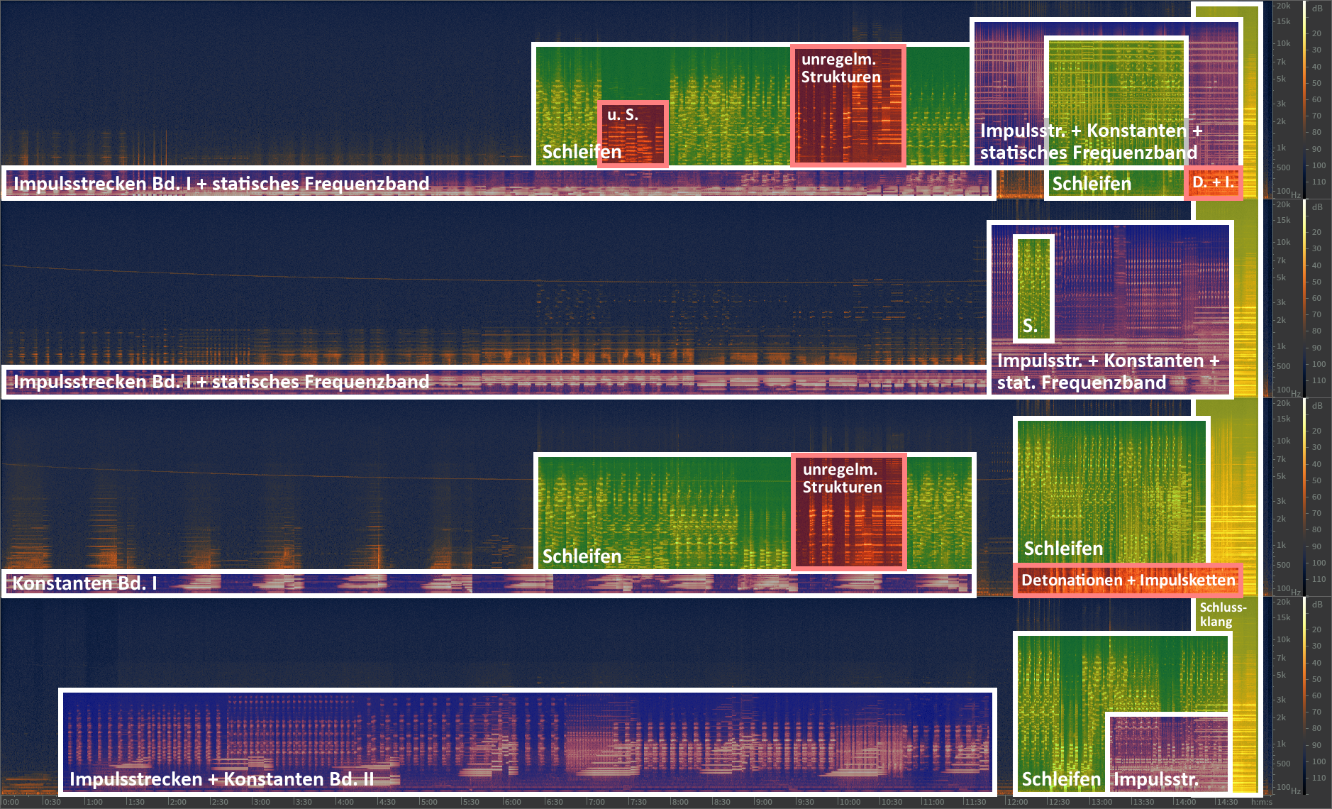 Abbildung 25: Tratto, Digitalisat des Kölner Tonbands, Spektrogramm des Gesamtverlaufs mit Visualisierung wichtiger musikalischen Strukturen